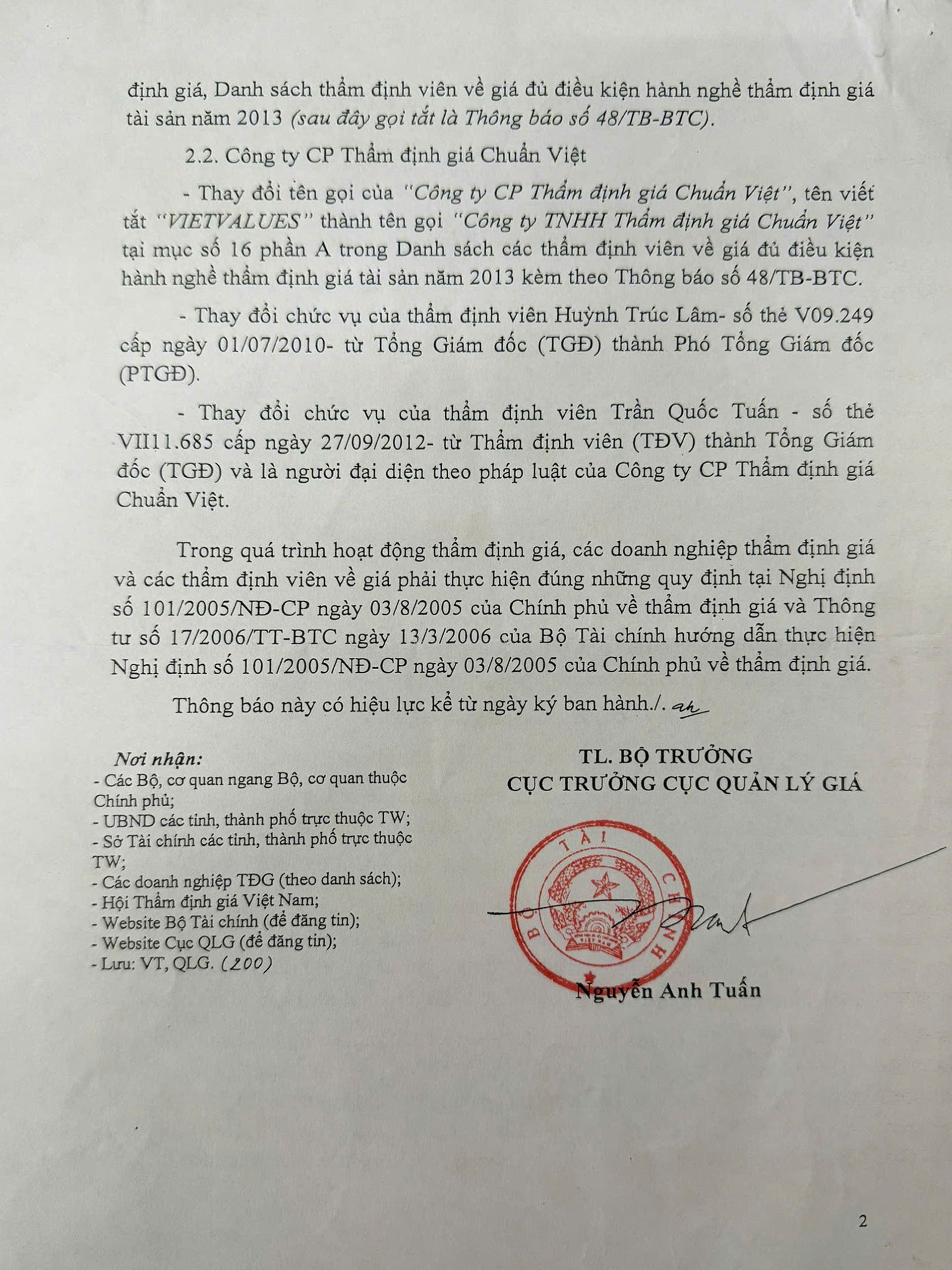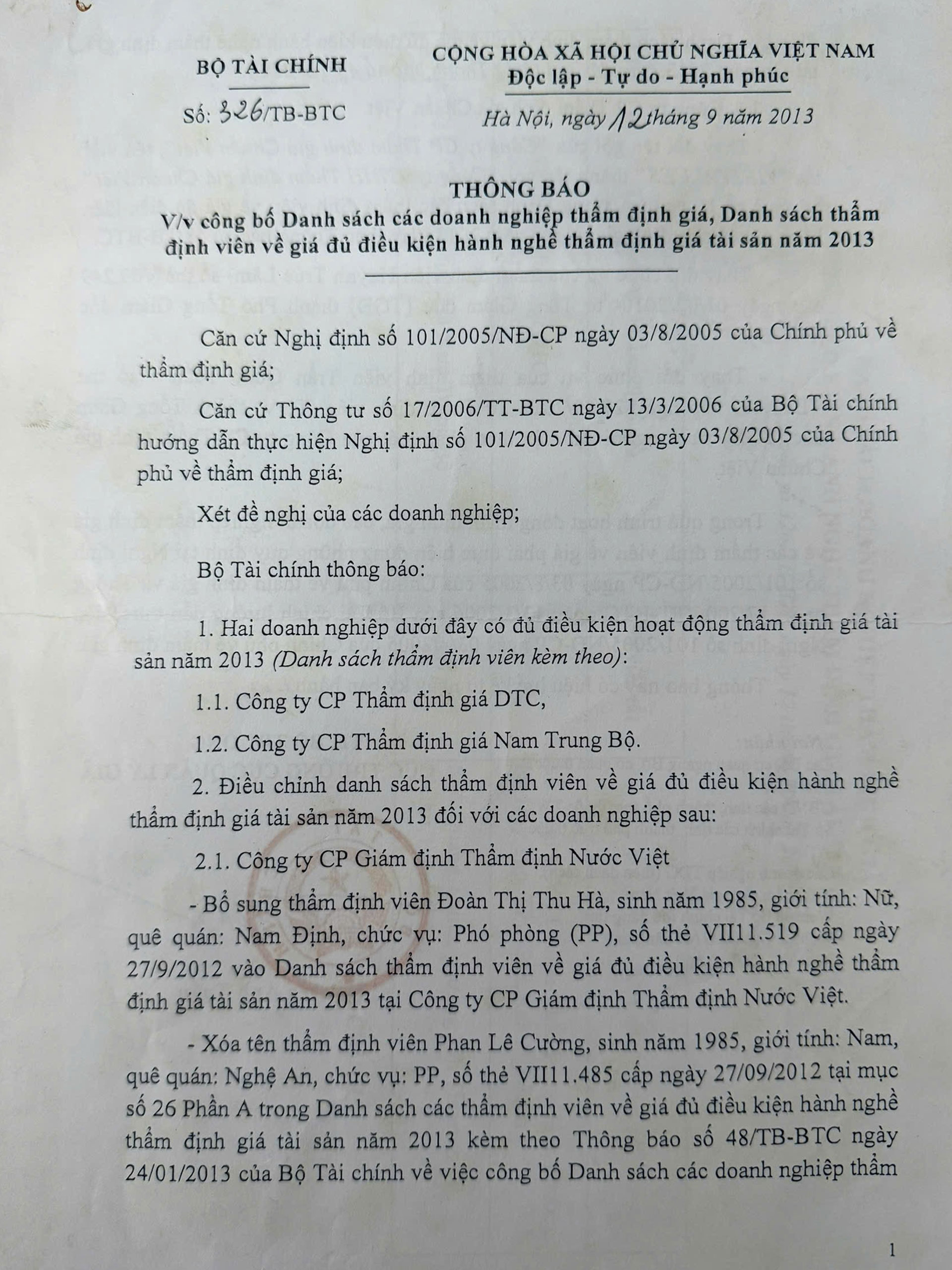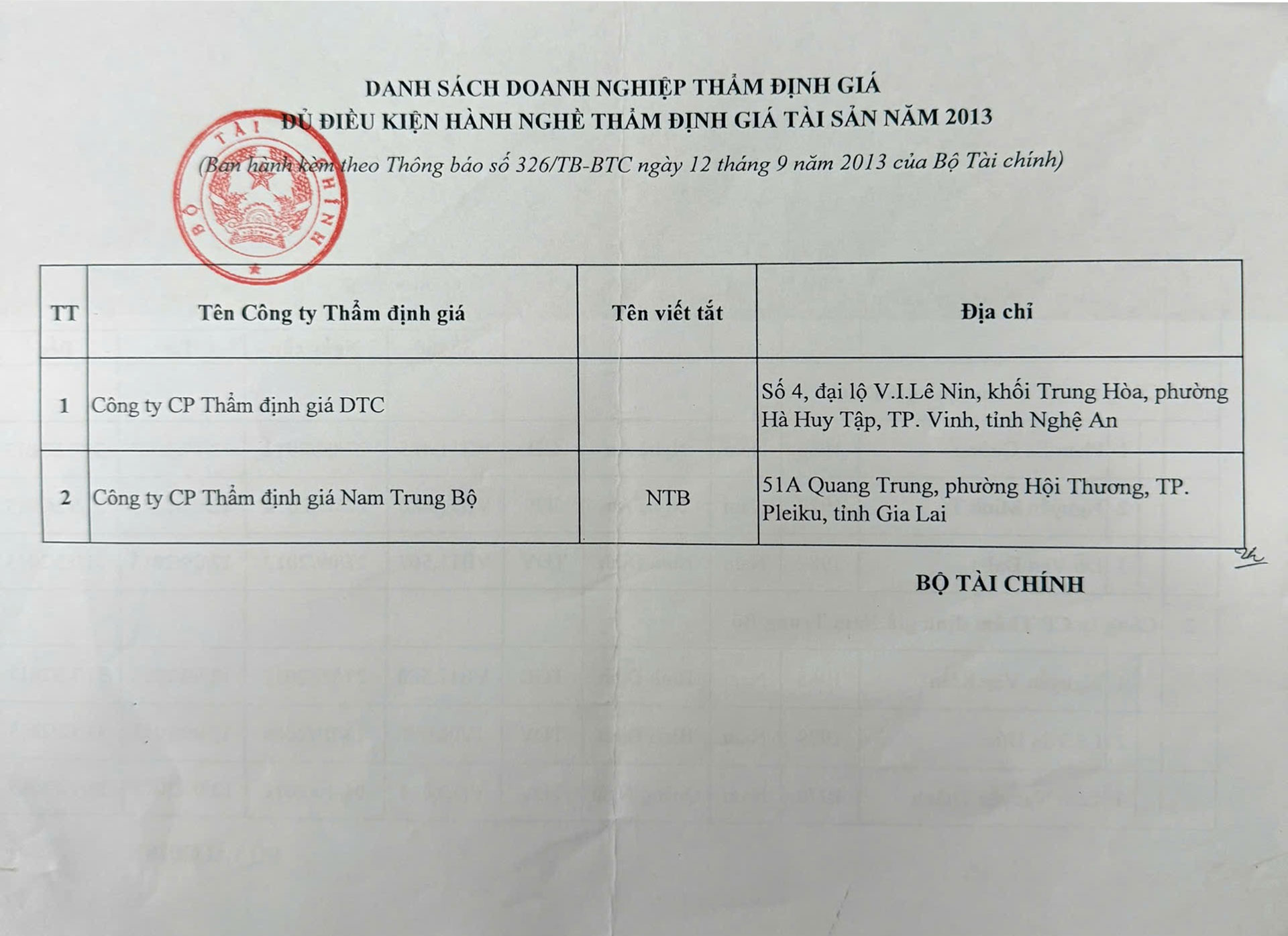 Doanh nghiệp có đủ điều kiện hoạt động thẩm định giá qua các năm tại Thông báo số 326/TB-BTC ngày 12/9/2013; Thông báo số 57/TB-BTC ngày 20/01/2014; Thông báo số 38/TB-BTC ngày 20/01/2015; Thông báo số 19/TB-BTC ngày 08/01/2016; Thông báo số 54/TB-BTC ngày 24/01/2017; Thông báo số 39/TB-BTC ngày 11/01/2018; Thông báo số 1083/TB-BTC ngày 28/12/2018; Thông báo số 1240/TB-BTC ngày 31/12/2019; Thông báo số 1079/TB-BTC ngày 31/12/2020; Thông báo số 1045/TB-BTC ngày 30/12/2021; Thông báo số 955/TB-BTC ngày 30/12/2022; Thông báo số 1315/TB-BTC ngày 29/12/2023 và Thông báo số 1271/TB-BTC ngày 31/12/2024 của Bộ Tài chính về việc công bố Danh sách thẩm định viên về giá đủ điều kiện hành nghề thẩm định giá kể từ ngày 01 tháng 01 năm 2025 tại các doanh nghiệp thẩm định giá. Như vậy Công ty đủ điều kiện hoạt động liên tục tại các năm 2013, 2014, 2015, 2016, 2017, 2018, 2019, 2020, 2021, 2022, 2023,2024 và 2025.